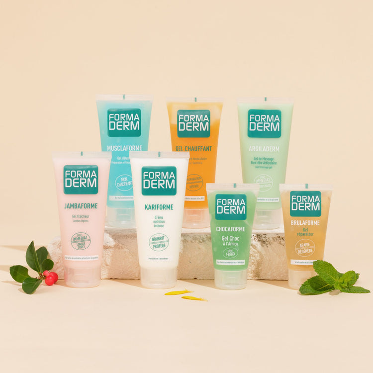 Ce kit contient : - 1 gel Argiladerm 100ml pour apaiser les zone sensibles - 1 gel Chauffant 100ml pour détendre et apaiser les raideurs, tensions musculaires - 1 gel Musclaforme 100ml pour la préparation et récupération musculaire - 1 gel Jambaforme 100ml pour les jambes fatiguées - 1 crème Kariforme 100ml pour nourrir, répaerer et protéger la peau - 1 gel Chocaforme 50ml pour les bleus/bosses - 1 gel Brulaforme 50ml pour régénérer les peaux abimées, irritées ou fendillées.